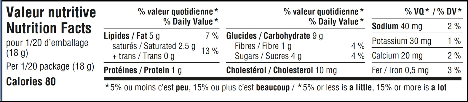 Fabriqué dans un environnement SANS gluten, produits laitiers, arachide, noix, soja et sésame.